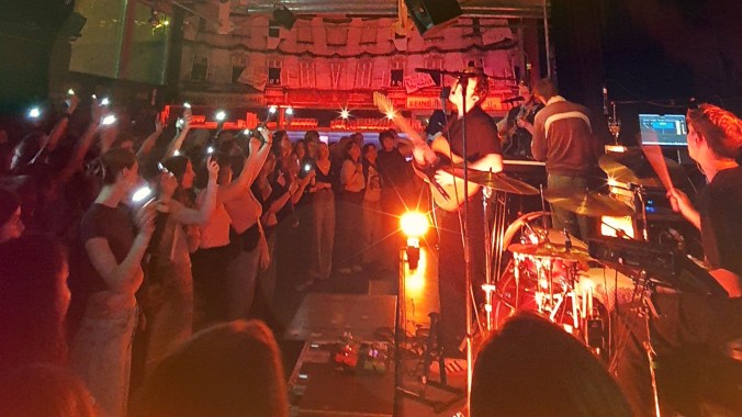 Kurz bevor sich das Konzert auch schon wieder dem Ende zuneigte, wurde mit dem Publikum eine kleine Choreo einstudiert („Ein Schritt vor, ein Schritt zurück und drehen“). Gesagt getan: Der ganze Raum ist sich am Drehen.
