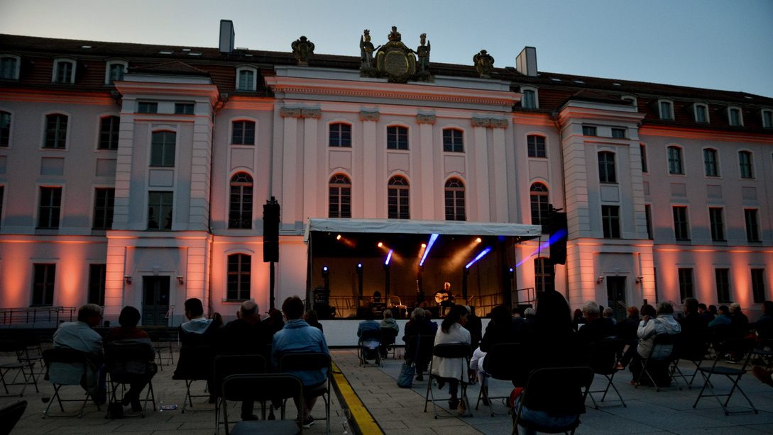 Der Auftritt auf der Bühne im Innenhof des Universitätshauptgebäudes war eingerahmt von besonderem Flair: Umgeben von dem alten Astronomieturm und den Hörsaalgebäuden entstand ein gemütliches, sommerliches Ambiente.